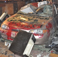 Many of the working appliances are plugged in, turned on and then go off the porch 'live'. Mayhem and reckless abandon ensue as toasters, phones, blenders, stoves, dryers and air conditioners rain down from the balcony on the target vehicle. The festivities continue into the early hours of the first day of the new year. The various small and large appliances are first tossed, then retossed, hurled and even swung like baseball bats at the hapless target. The vehicle is destined for the junkyard crusher, filled with broken, smashed and dismembered appliances. Beef & beer are customary appliance toss food & drink. A drink of champagne in the new year sometime after midnight is also customary. No champagne glasses are needed just pass the bottle around.... |